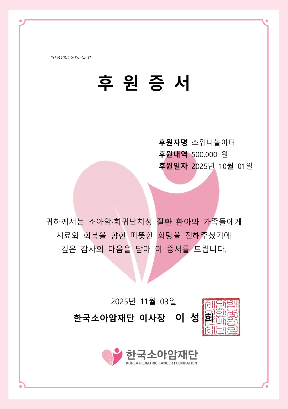 25년 9월 한국소아암재단 후원 증서