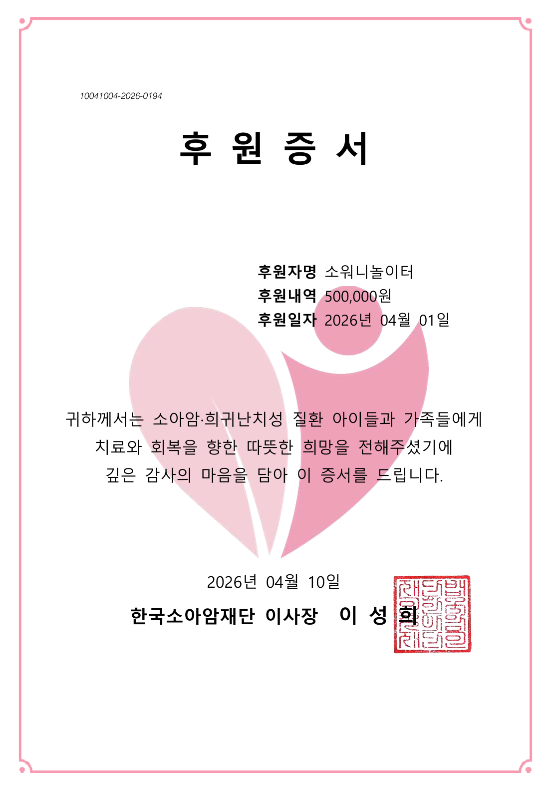 26년 3월 한국소아암재단 후원 증서
